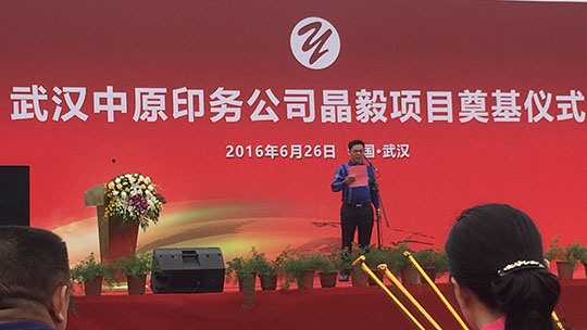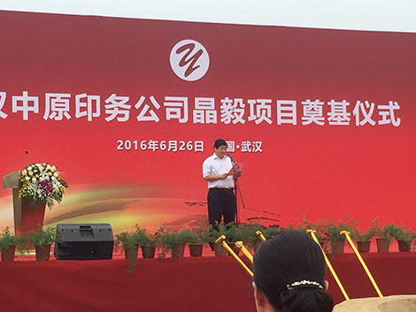 東西湖臺商投資區(qū)主任代表東西區(qū)各級領(lǐng)導發(fā)表重要講話,對武漢中原印務(wù)公司晶毅項目在此舉行奠基表示最衷心的祝賀和寄予深切的厚望!