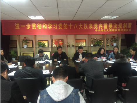 為了深入貫徹落實(shí)黨的十八屆六中全會精神,增加思想政治教育,加強(qiáng)黨的知識普及,2016年11月21日下午,湖北大集建設(shè)集團(tuán)黨委組織全體黨員同志在集團(tuán)會議室集中學(xué)習(xí)《中國共產(chǎn)黨章程》、《中國共產(chǎn)黨廉潔自律準(zhǔn)則》、《關(guān)于新形勢下黨內(nèi)政治生活的若干準(zhǔn)則》、《中國共產(chǎn)黨紀(jì)律處分條例》等黨內(nèi)文件和重要法規(guī)制度。