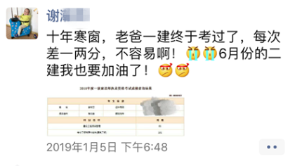 成功會(huì)遲到卻不曾缺席,2017年,謝守衛(wèi)通過(guò)經(jīng)濟(jì)與法規(guī)科目,2018年,通過(guò)管理與實(shí)務(wù)科目。十年磨“一建”,謝守衛(wèi)用他的堅(jiān)持與努力向我們?cè)忈屃艘痪湓?huà):想要學(xué)有所成,有所收獲,就必須要努力地去堅(jiān)持!