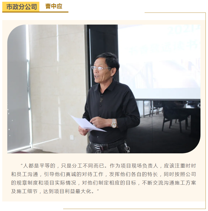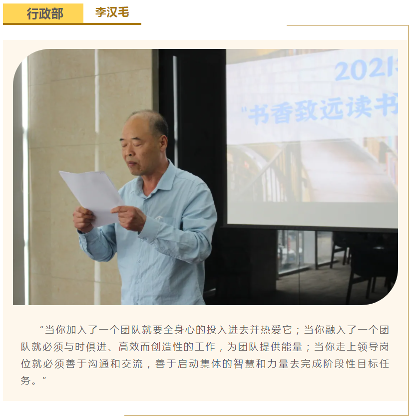 此次中高層領(lǐng)導(dǎo)共讀并分享的書(shū)籍是《麥肯錫團(tuán)隊(duì)管理法》,集團(tuán)公司七位部門(mén)負(fù)責(zé)人依次上臺(tái),結(jié)合各自的實(shí)際工作、管理經(jīng)驗(yàn)等,對(duì)書(shū)中的觀點(diǎn)進(jìn)行闡述與分析。在思想交流碰撞中,各位部門(mén)負(fù)責(zé)人進(jìn)一步加深了對(duì)團(tuán)隊(duì)管理的認(rèn)識(shí),反思了自己在部門(mén)管理中存在的問(wèn)題,了解了更多的管理細(xì)節(jié),學(xué)習(xí)了更有效的管理方法,為今后更好地完成日常管理工作打下了堅(jiān)實(shí)的基礎(chǔ)。