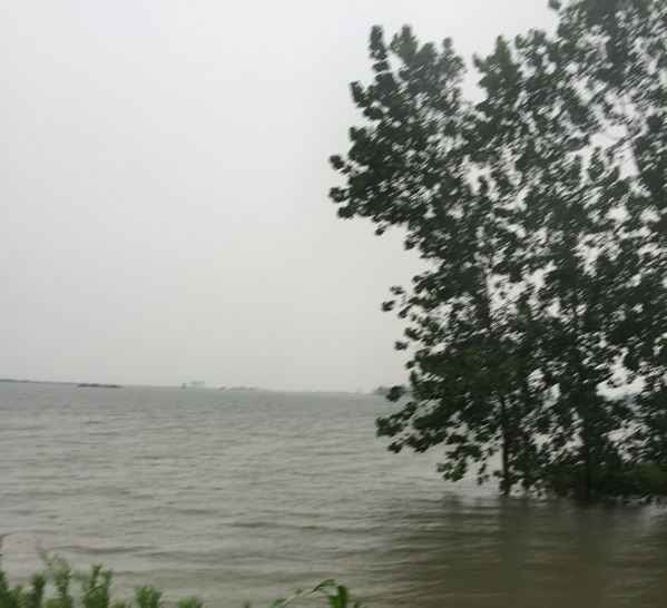車子行駛在大堤上,隨處可見紅旗招展,黨旗迎風飄揚,隔段就有帳篷拉起來的簡陋住所。這里的田疇已經(jīng)完全泡在水里,稻谷和高梁果樹已浸泡得不成樣子。大堤上雖然不知道有多少人筑守在這里,一路行駛中到處可以看到分村分段守護的標牌矗立著。